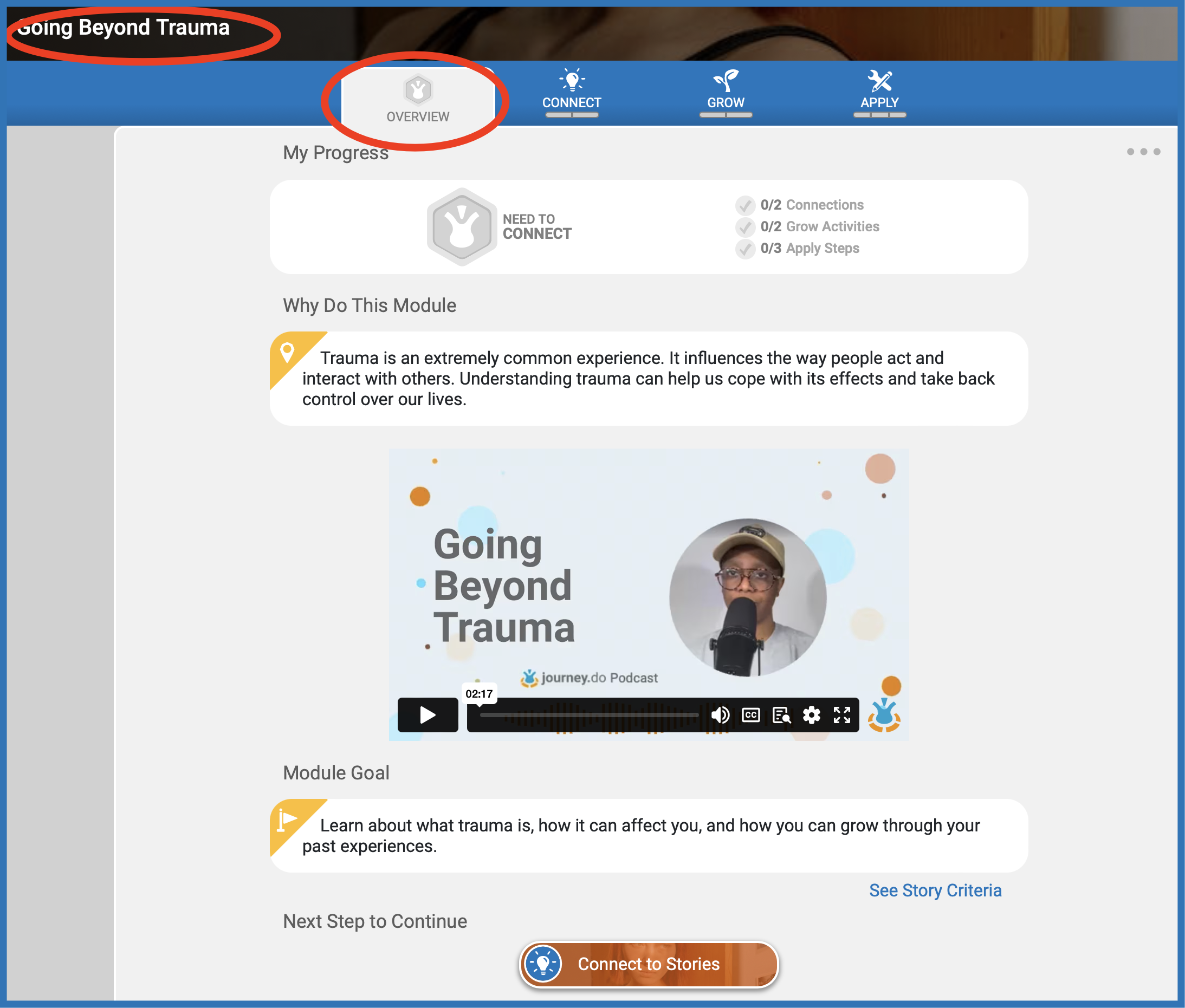 - Click on the module card. You will see that a module is divided into 4 tabs: Overview, Connect, Grow, Apply. (Each of these will be explained in more detail below)