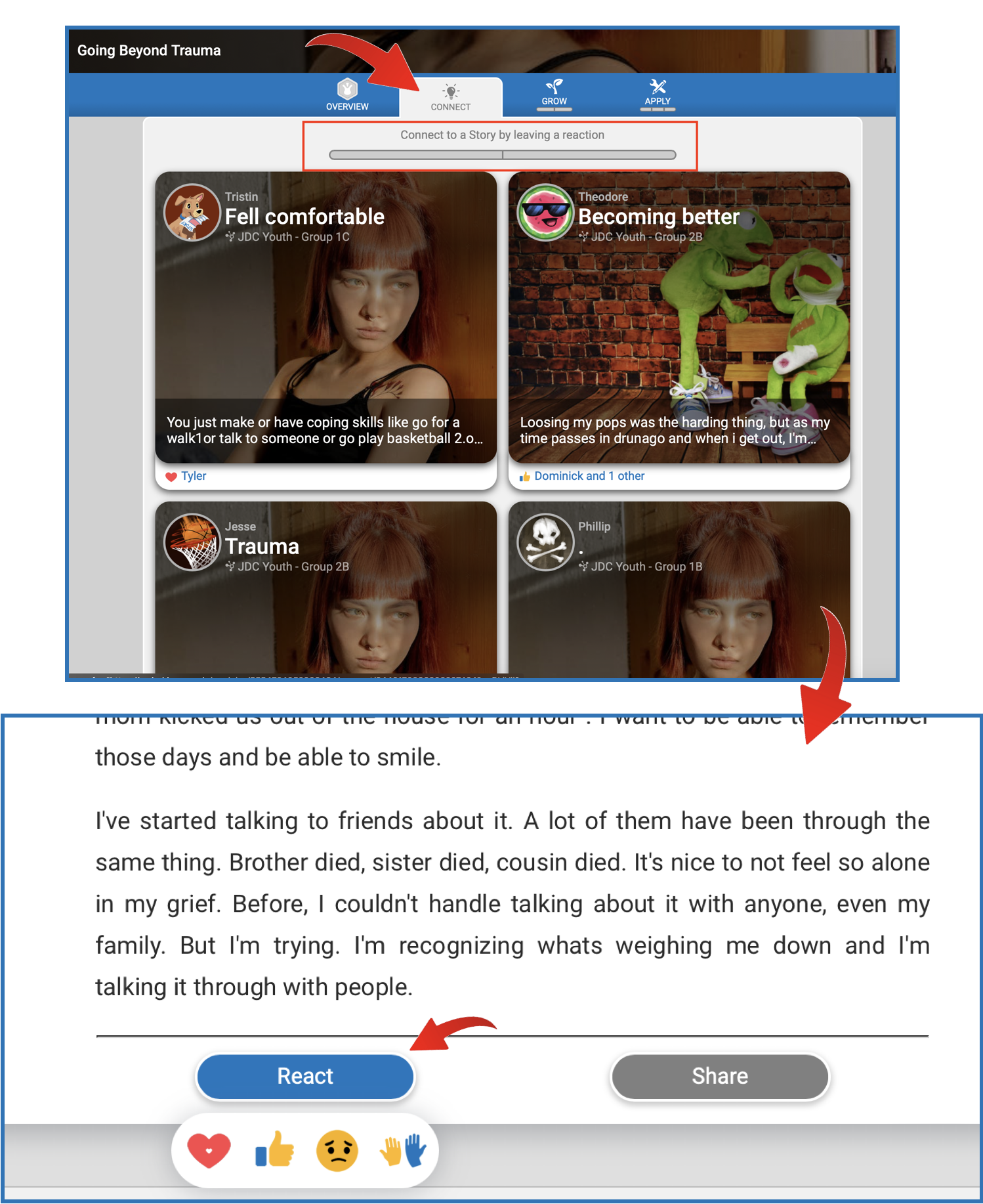 - Click on any story card that you want to read and connect to the author by leaving an emoji or a comment (if commenting is available).