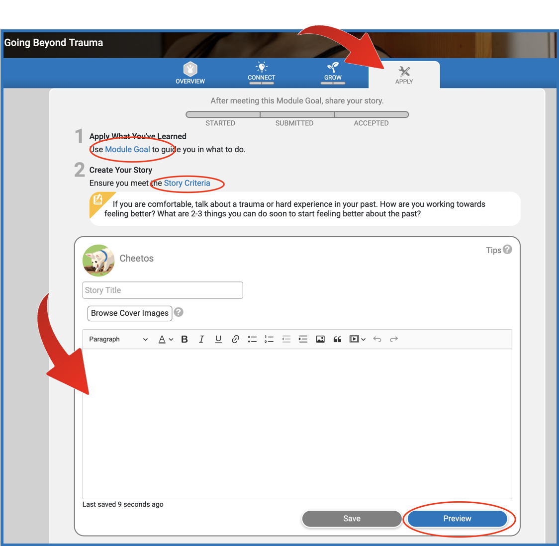 - Go to the Apply tab. Review the Module Goal and Story Criteria.