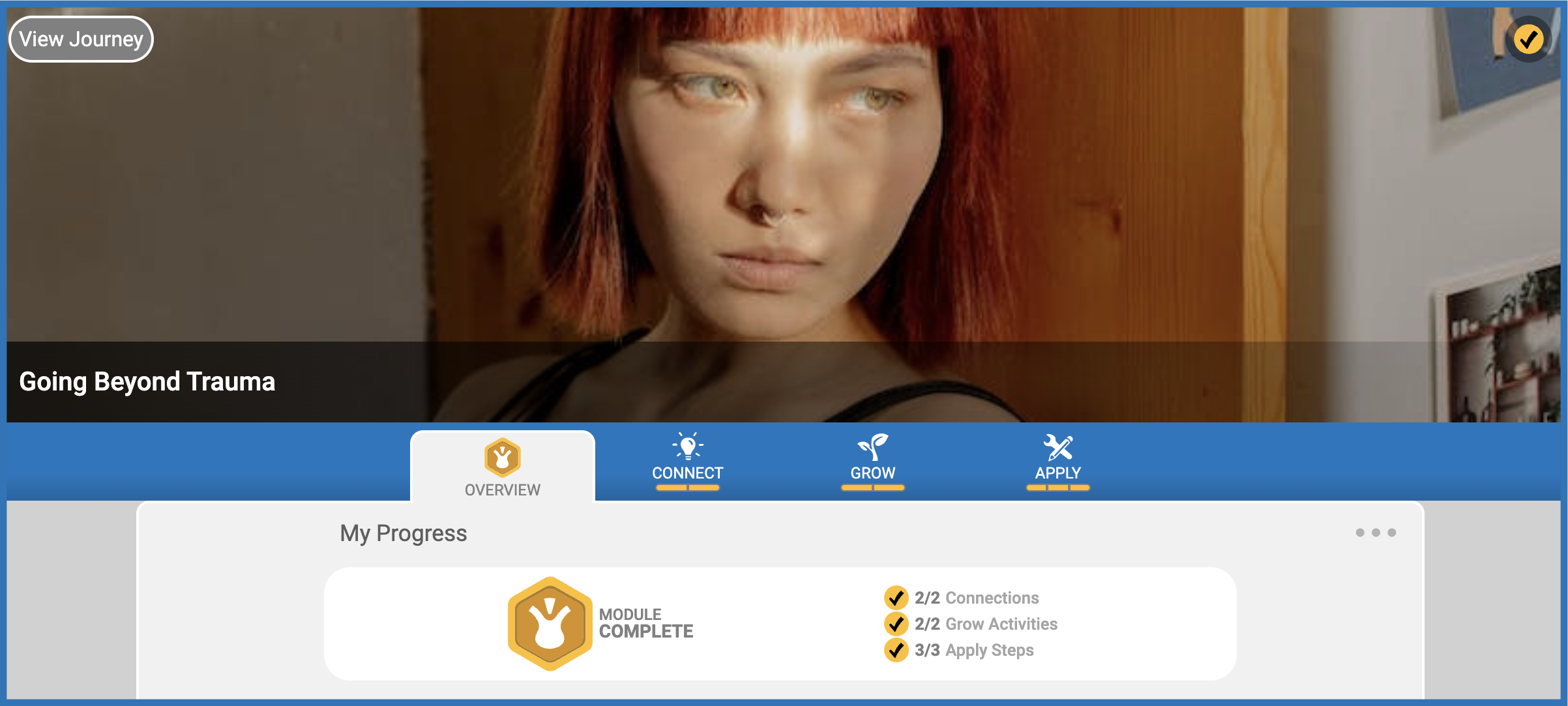 - Once all Connect/Grow/Apply requirements are reached, the module will automatically be marked with a yellow checkmark which indicates that you have successfully completed the module.