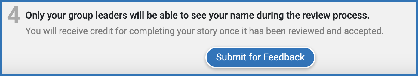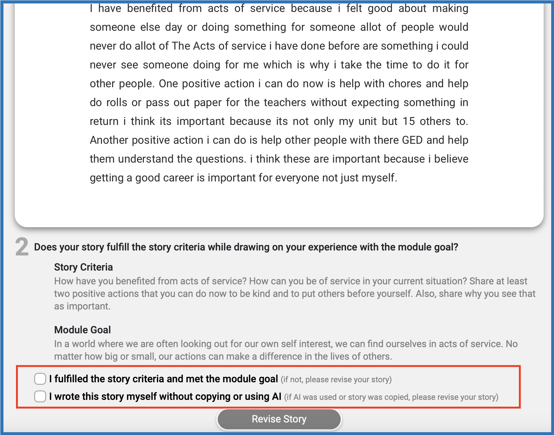 - Review your story and make sure it meets the criteria and module goal. Also, check the 2 boxes when you are ready to submit. But if you feel that some changes are needed, click on Revise Story instead.