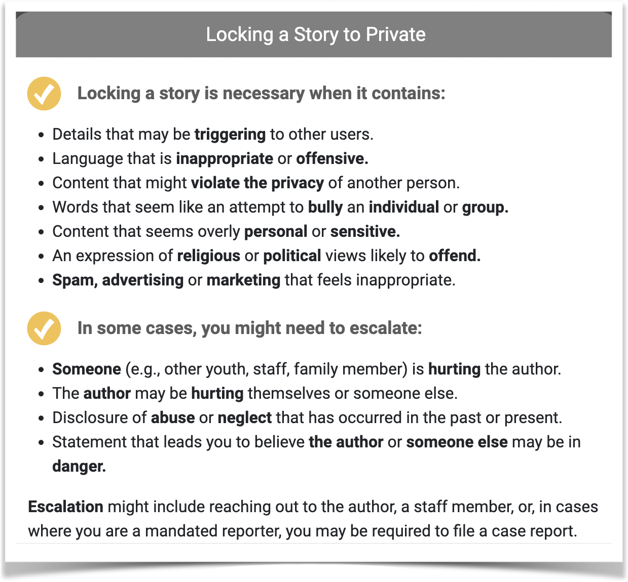 - Story privacy: Some stories can be approved but can’t be made public for important reasons. In such a case, you may check the box for Lock to Private. (see When to Lock a Story to Private.)