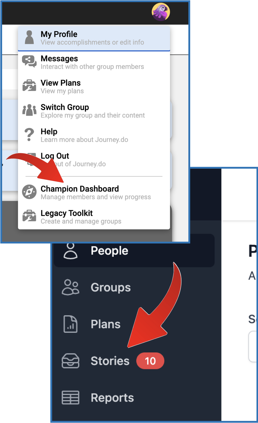 Access the Champion Dashboard. Click on the Stories tab on the left navigation menu.