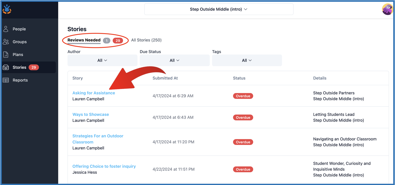 - All stories that have been reviewed will move to the "All Stories" sub-tab where the history of submissions and all reviewer's feedback on every story can be found.