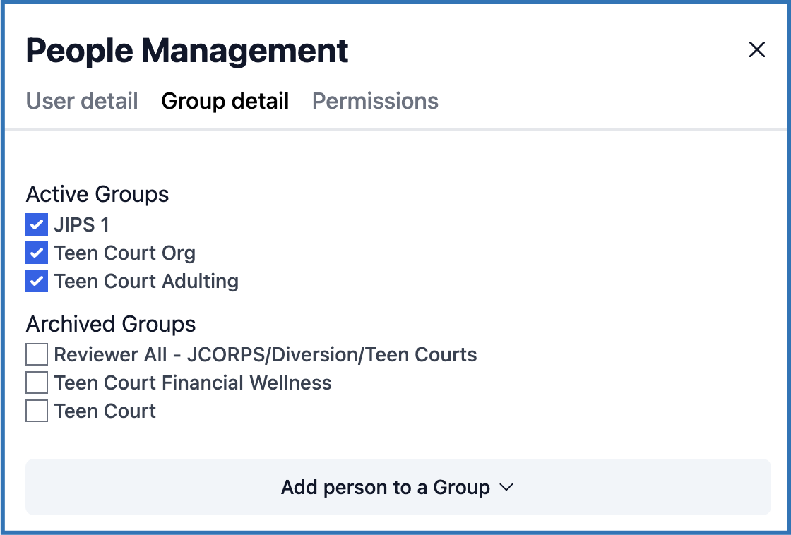 - To unarchive (reinstate access to the group) a member, check the corresponding box from the groups listed under Archived Groups. The group will move up under Active Groups.