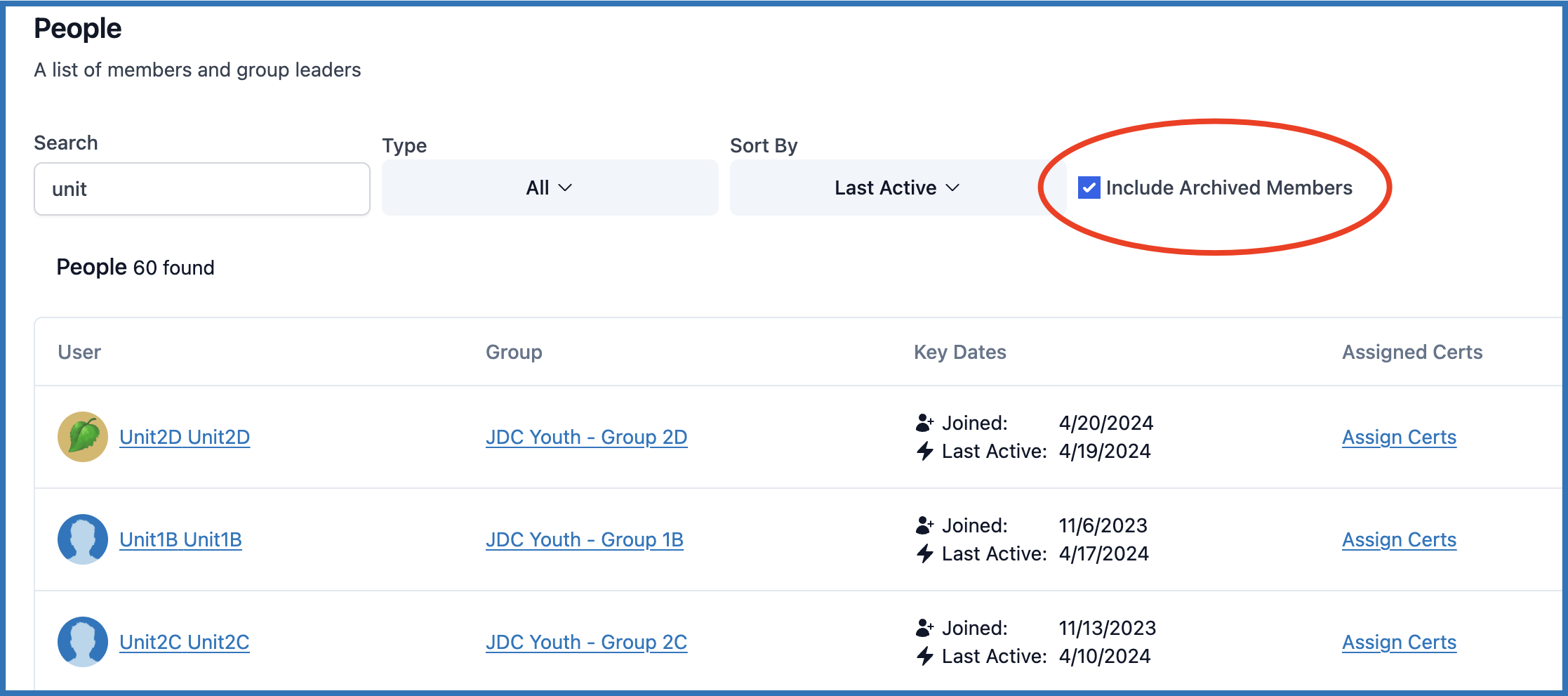 Important: If you are looking for a member who was previously archived in the group, make sure to check the box for "Include Archived Members" before searching.
