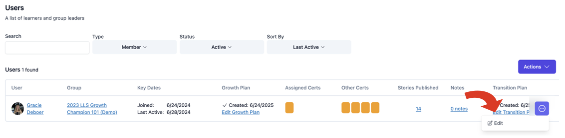 - Search for the member you need to archive. Scroll to the far right section and click on the three dots. Click on Edit.
