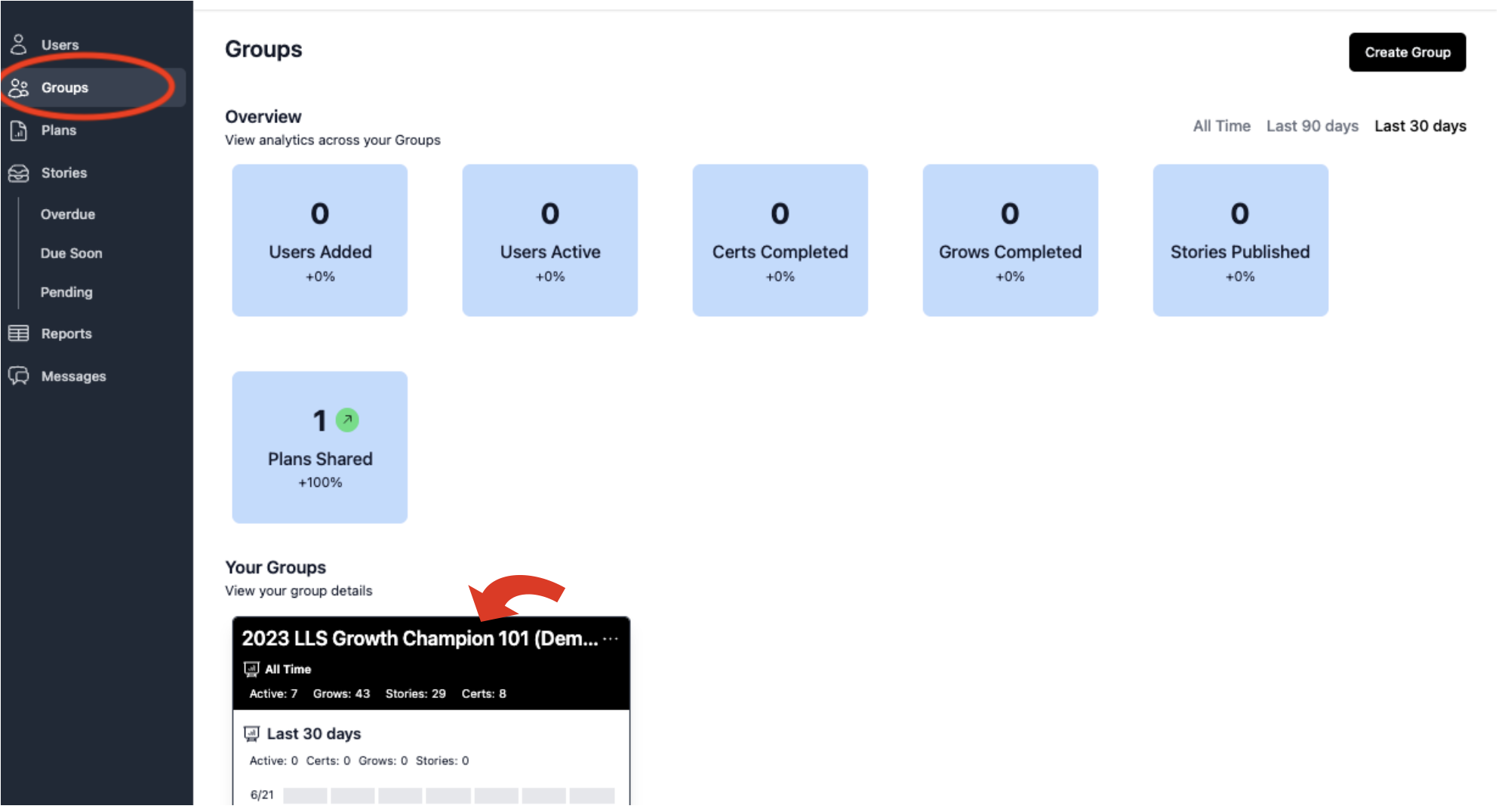 Access the Champion Dashboard. Go to Groups tab.