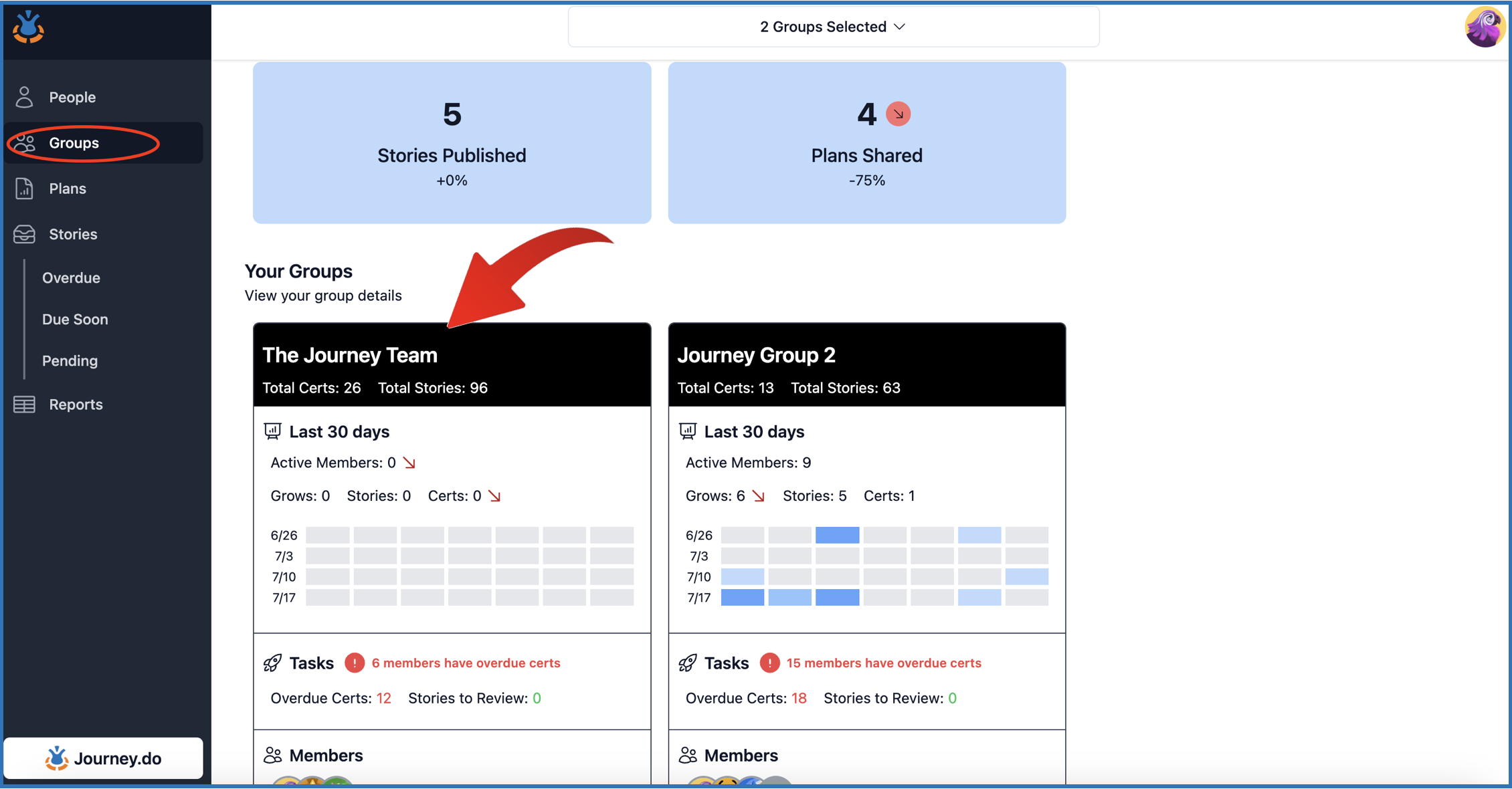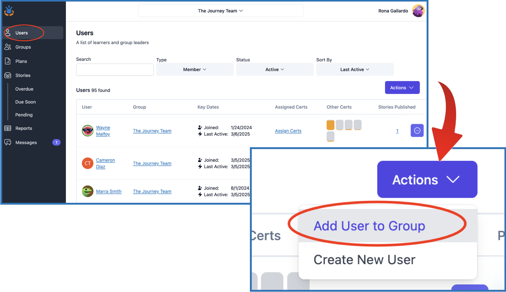 Access the Champion Dashboard. Go to either Users tab or Groups tab.