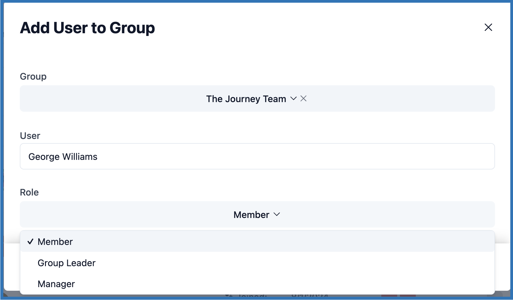 - Choose the Role of the user you're adding. (Note that only existing Managers can assign the "Manager" role to other users.)