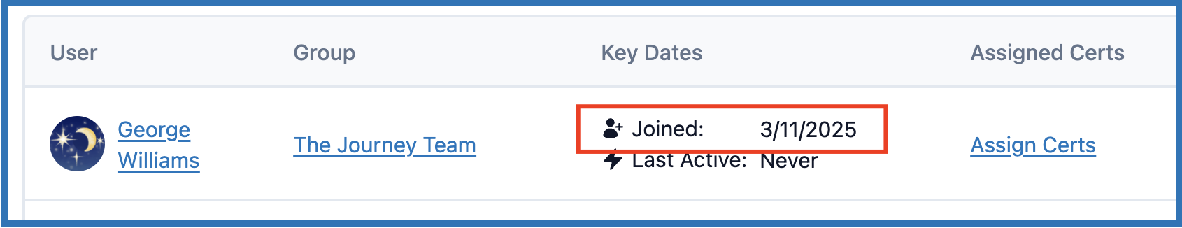- Back on the Users table, the name of the user you just added will appear at the top of the list.