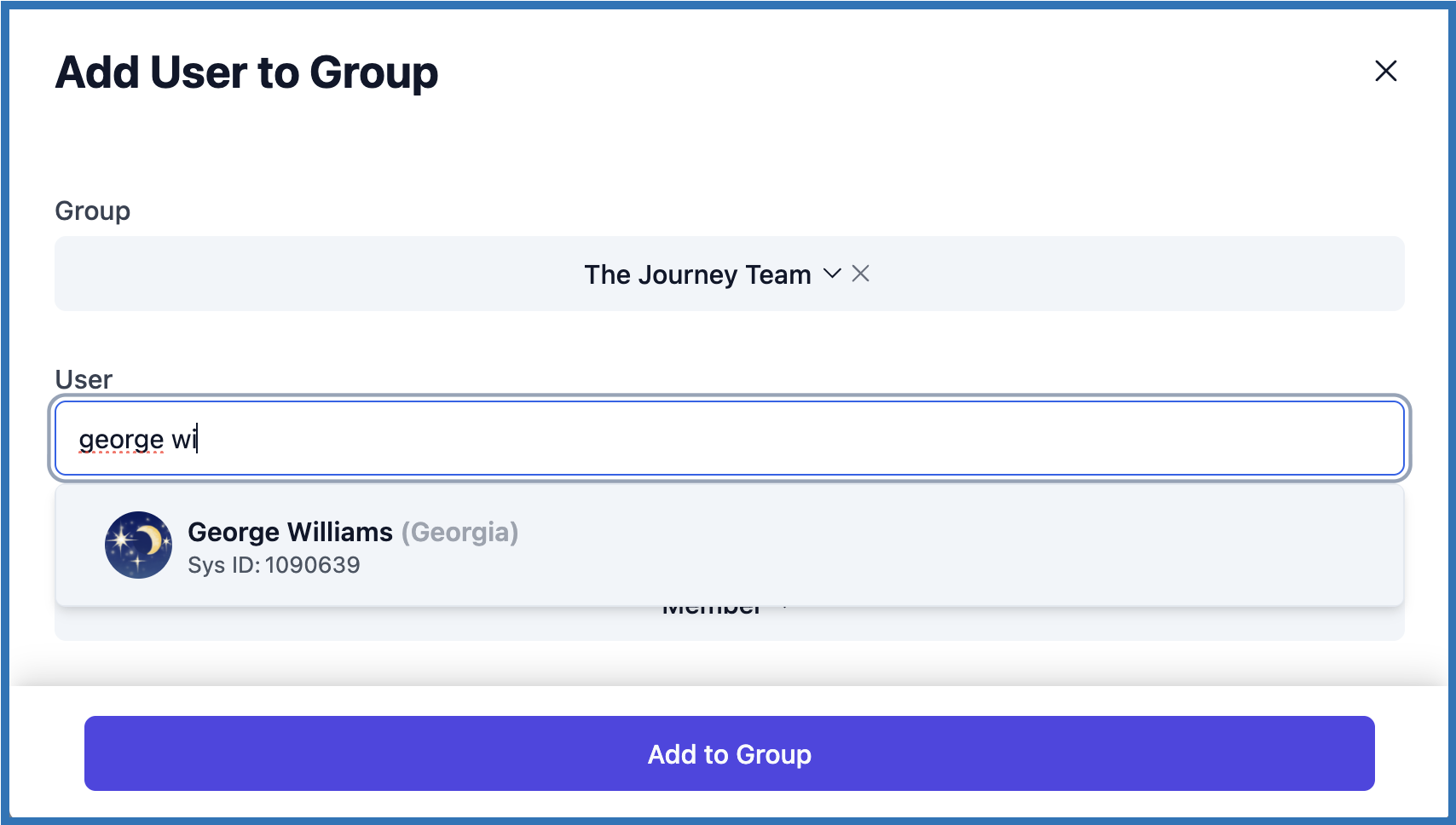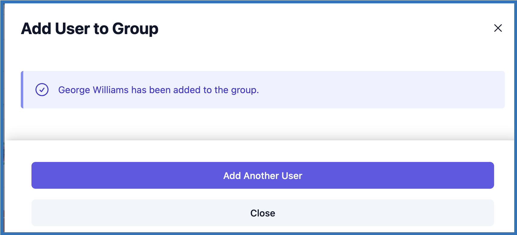 - Click the "Add to Group" button. There will be a confirmation that the user has been successfully added. You may choose to "Add Another User" or click 'Close' to exit.