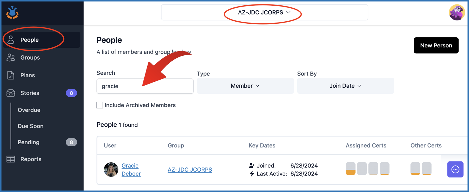 Search for the member you need to change the password for. (Make sure you have the correct group selected at the top filter to find the correct member.)