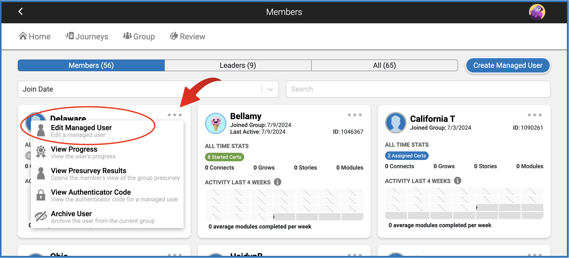 - Find the profile card of the member you need to reset the password for. Click on the three dots then select Edit Managed User.