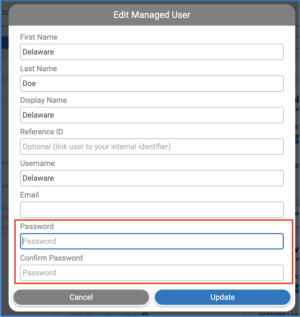 - On the Edit Managed User window, enter the new password, confirm, and click on Update button.