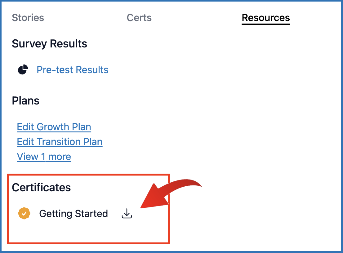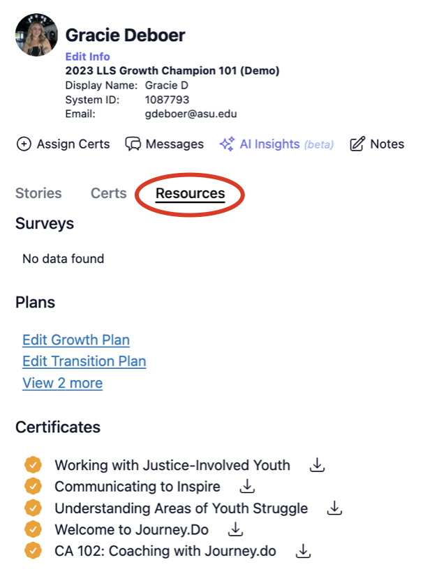 - Go to the Resources section. Under 'Certificates', you will find all certificates that the member has completed.