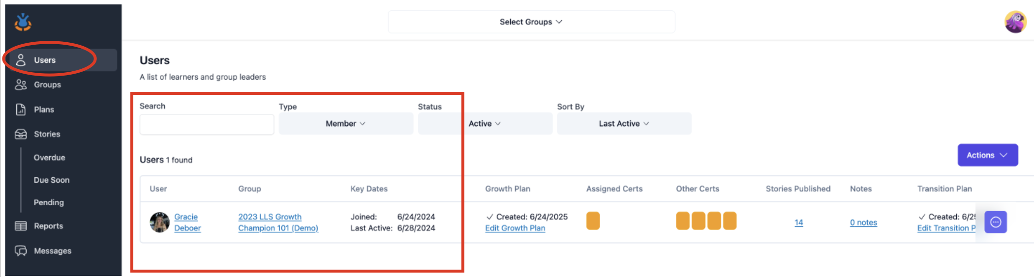 - Search for the member whose certificate you need to download. (Make sure that the correct group is selected at the top filter to easily find the member.)