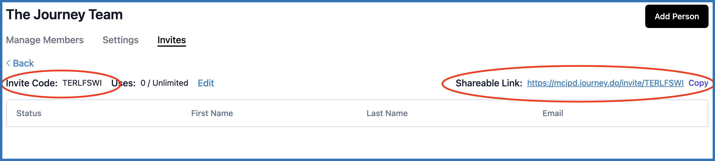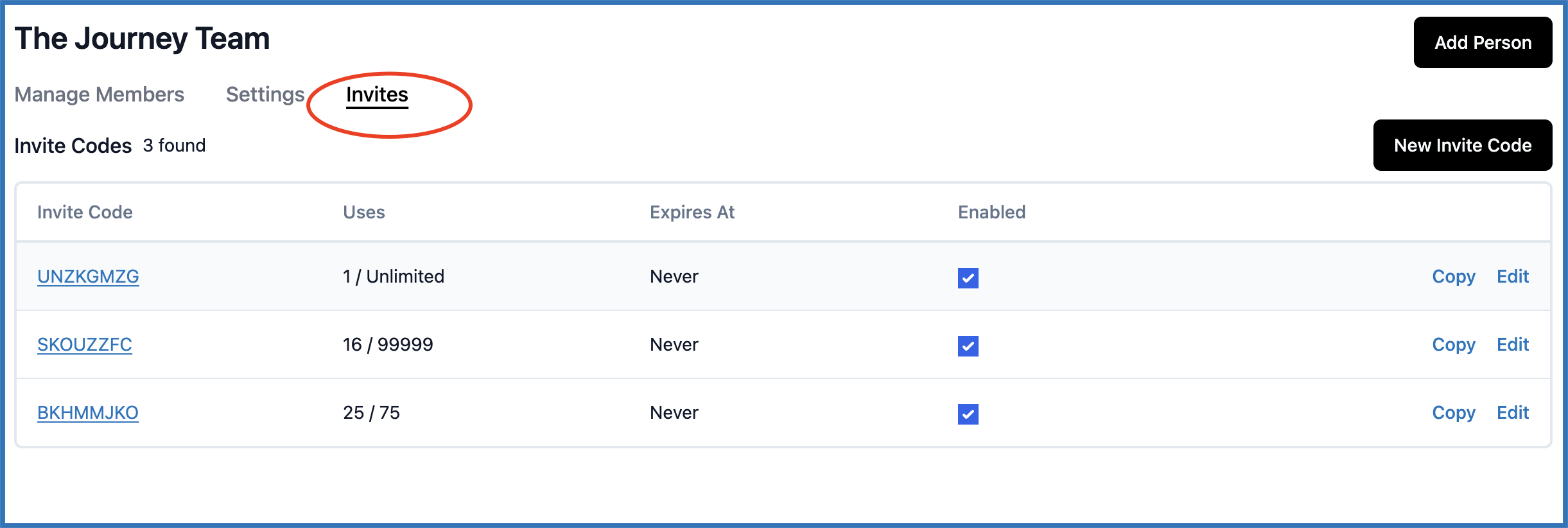 - If there are existing invite codes for the group, they will be displayed in the Invites section. Any existing invite code that has not expired and is not fully redeemed yet can still be used.