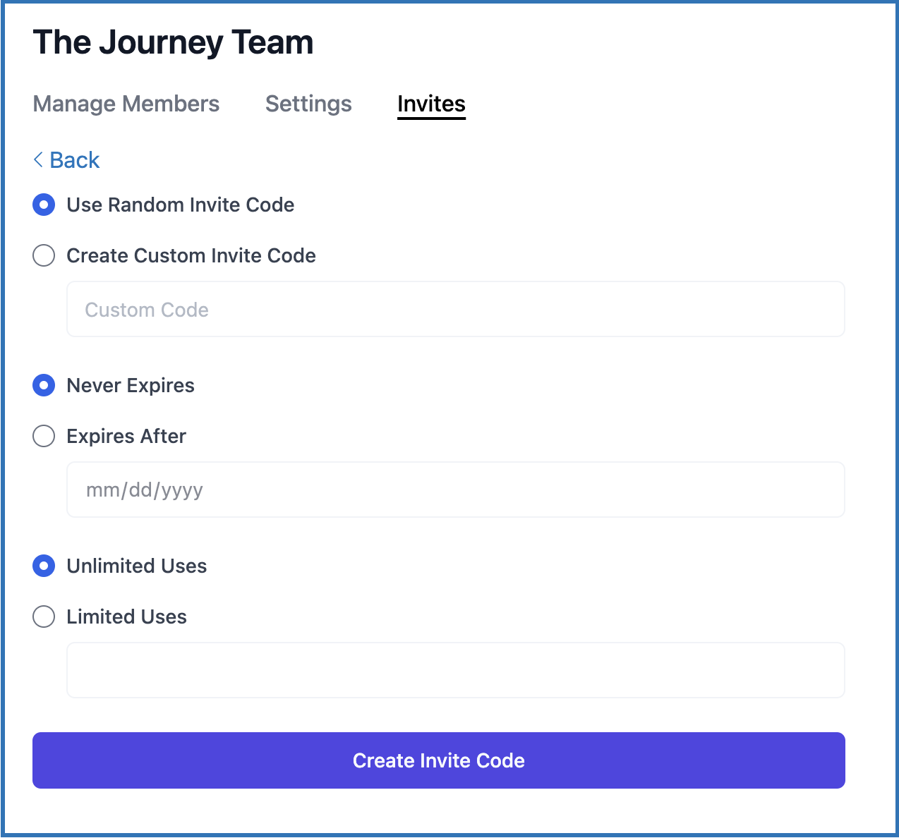 - To create a new one, click "New Invite Code" button. You may create a random invite code or set a custom one. You may also set an expiry date and a limit to the number of people who can use it if needed.