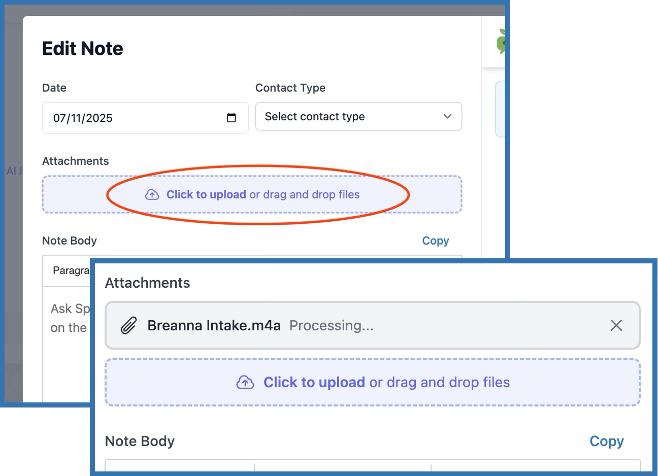 Create a case note from this PDForSummarize the attached recording into a structured note - Sprout will generate a suggested summary in the Note Body and/or Message to Learner fields