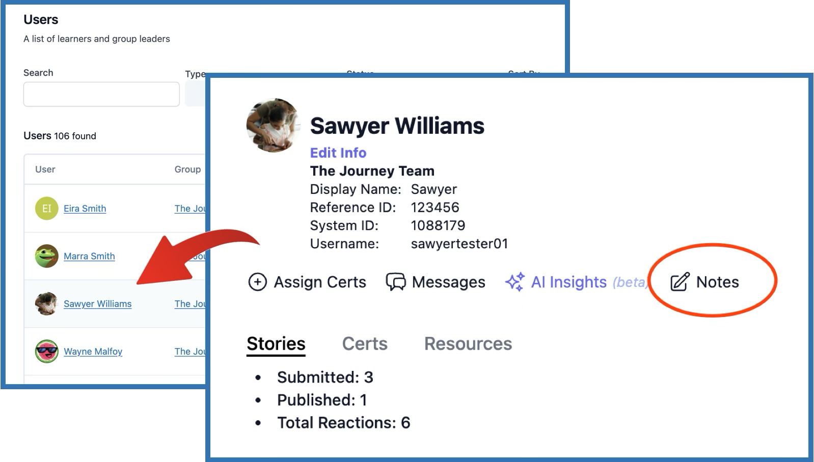 🔒 Note: If the Notes button is not visible on a learner’s profile, this feature may not be enabled for your account. Please contact support for access.