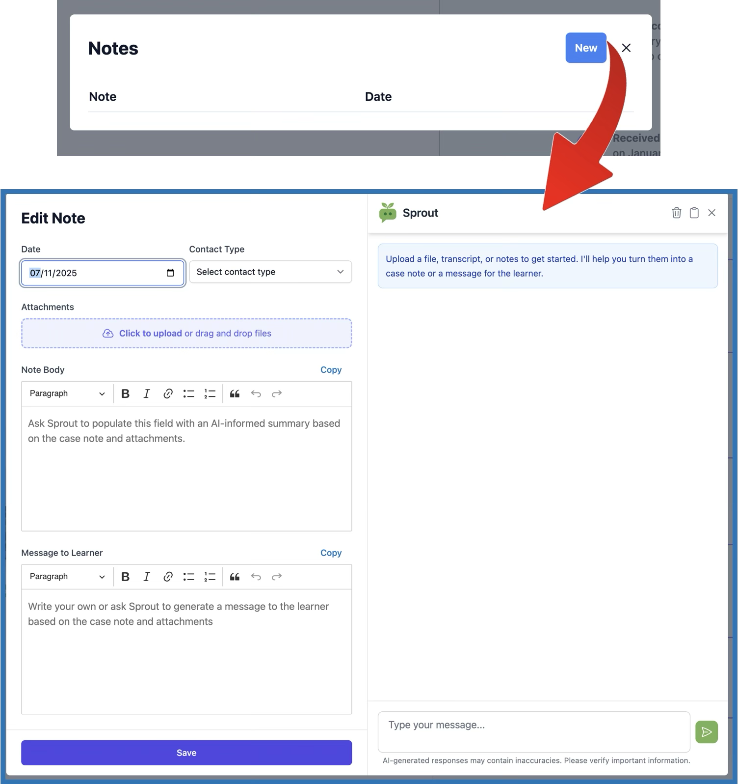 Case notes help Champions and staff track progress, supervision, and coaching touchpoints. You can create a note manually or ask Sprout, our AI assistant, to generate one using uploaded files like transcripts or recordings.