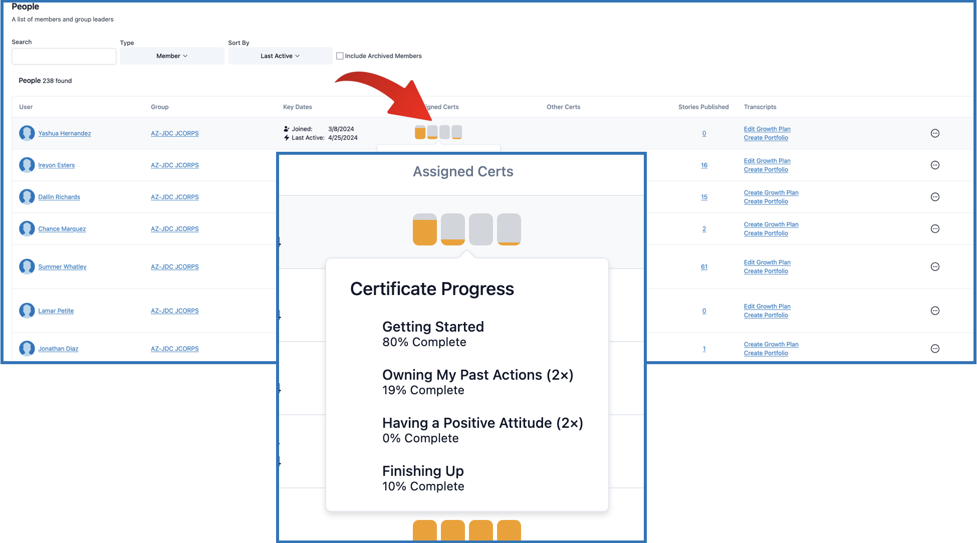 3. On the columns for Assigned Certs and Other Certs, there are colored rectangular icons that represent the number of certs that are assigned and not assigned to the members.
