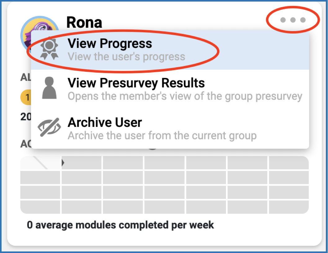 - Look for the profile card of the member whose progress you want to view. Click on the ellipsis (three dots).