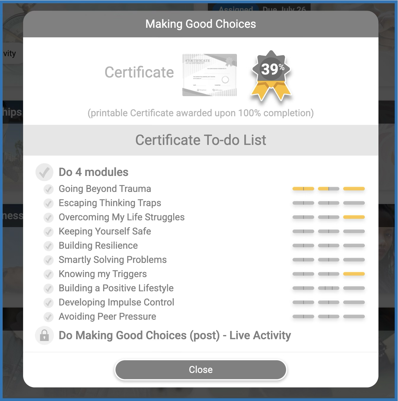 You can also click on the ribbon icon to see their progress on the module level. It will show how many modules they need to do and other additional activities like pre-survey and post-survey.