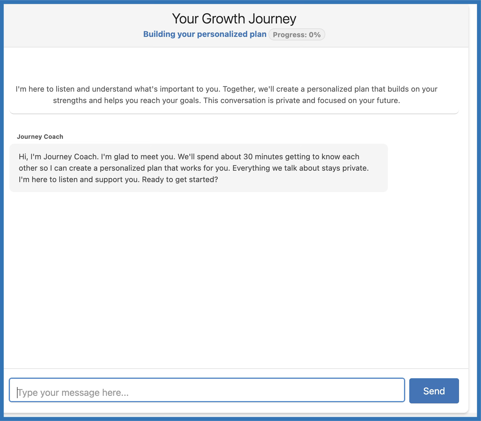 The intake is completed through a secure, structured chat in the learner’s Journey.do app.