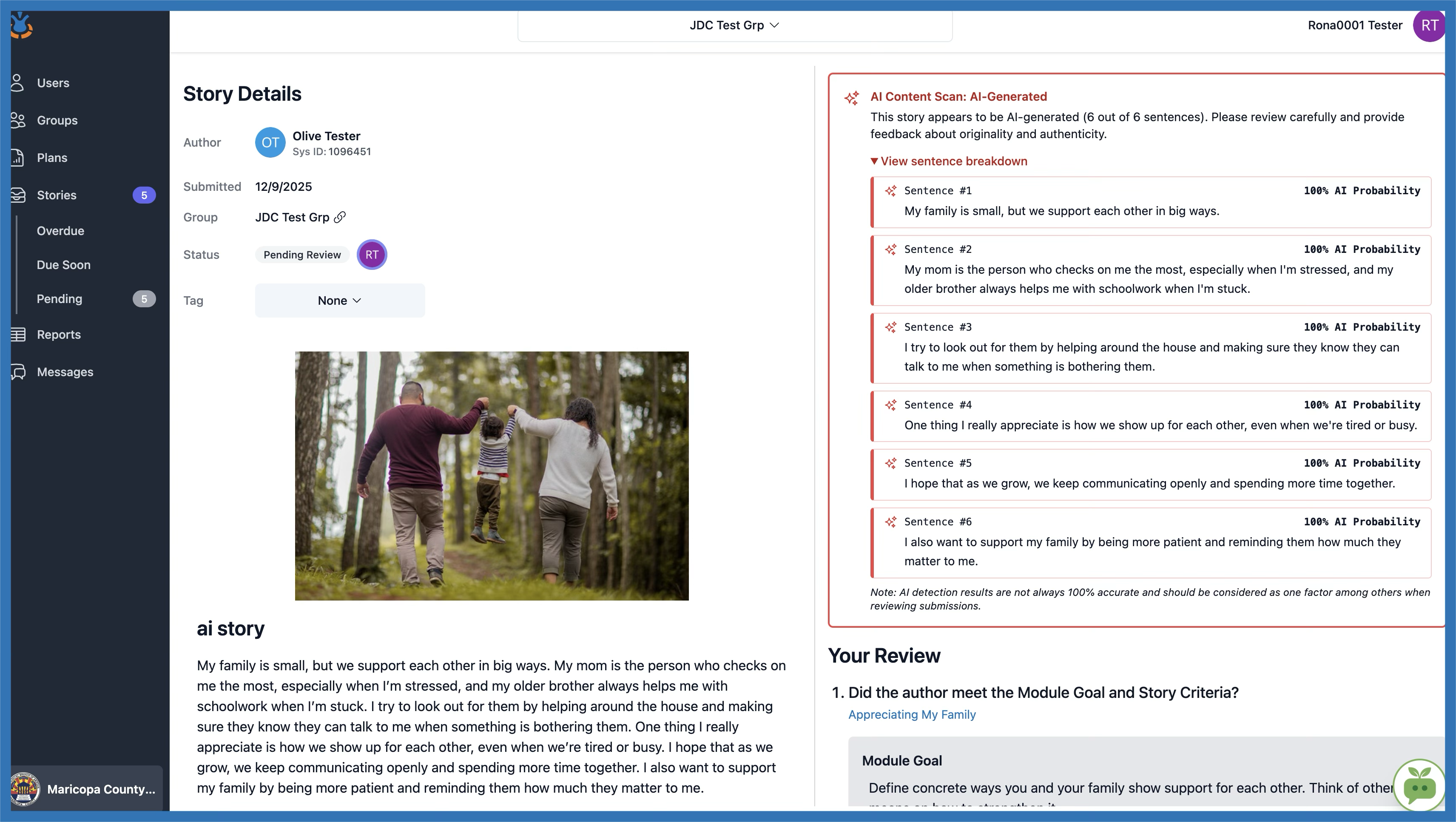 We’ve introduced an AI Content Detector to help reviewers understand whether a story appears to be written by the youth or generated using AI tools (like ChatGPT). This tool breaks down the content sentence by sentence and flags it as either AI-Generated, Human-Written, or a Mix of both.