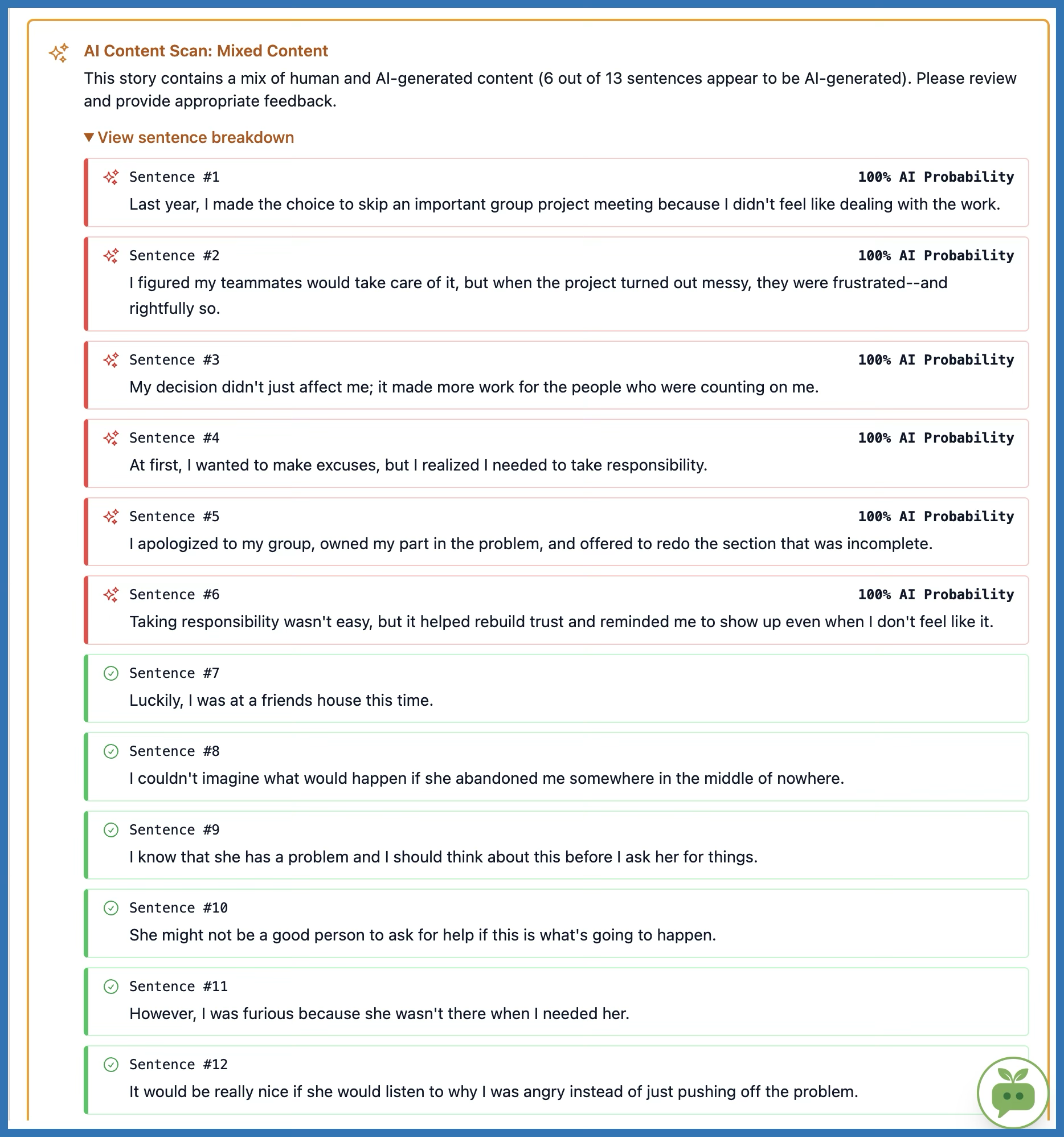 "AI Content Scan: AI-Generated"The message shows how many sentences were flagged (e.g., “6 out of 6 sentences”).