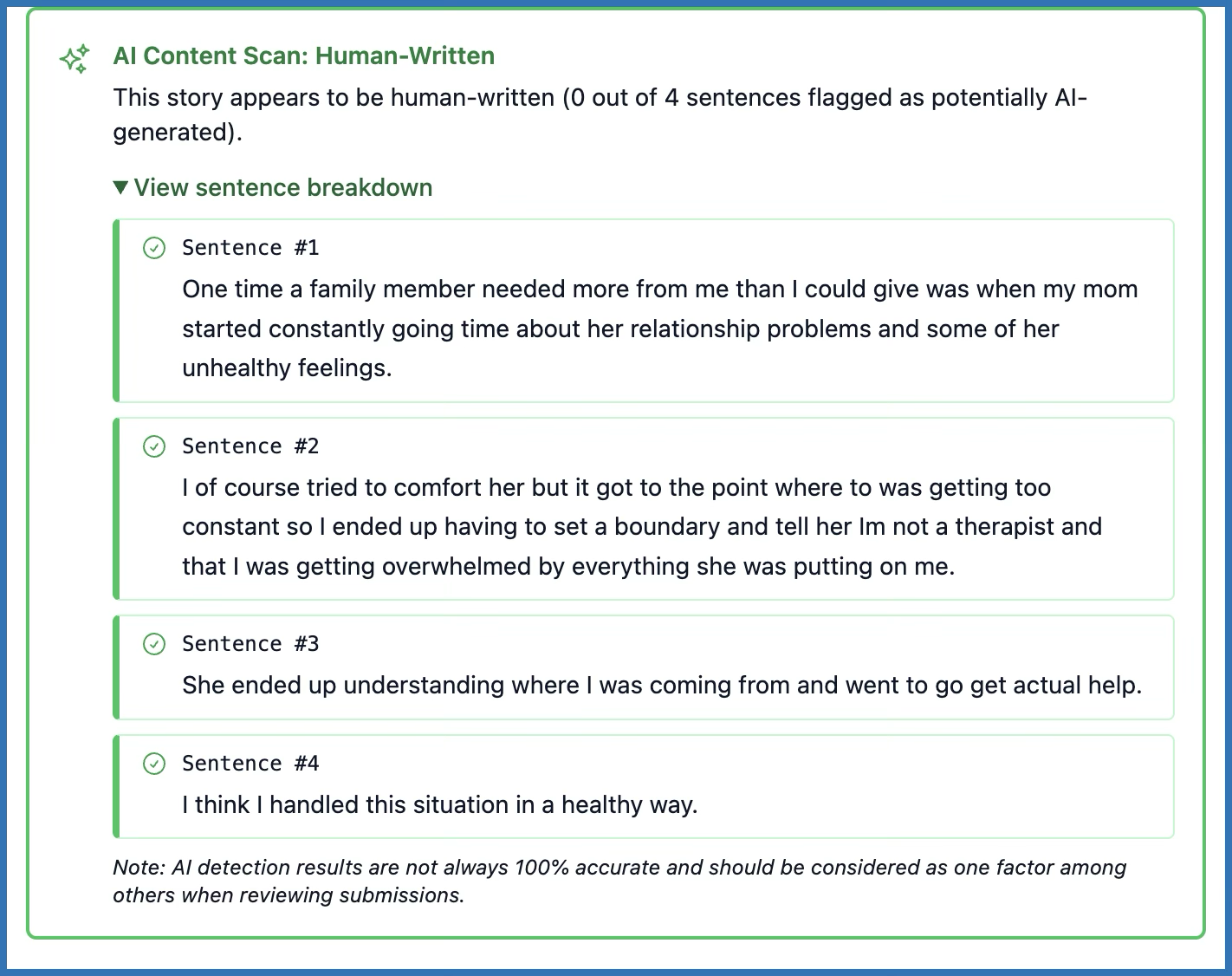 "AI Content Scan: Human-Written"A message confirms that 0 out of X sentences were flagged as AI-generated.