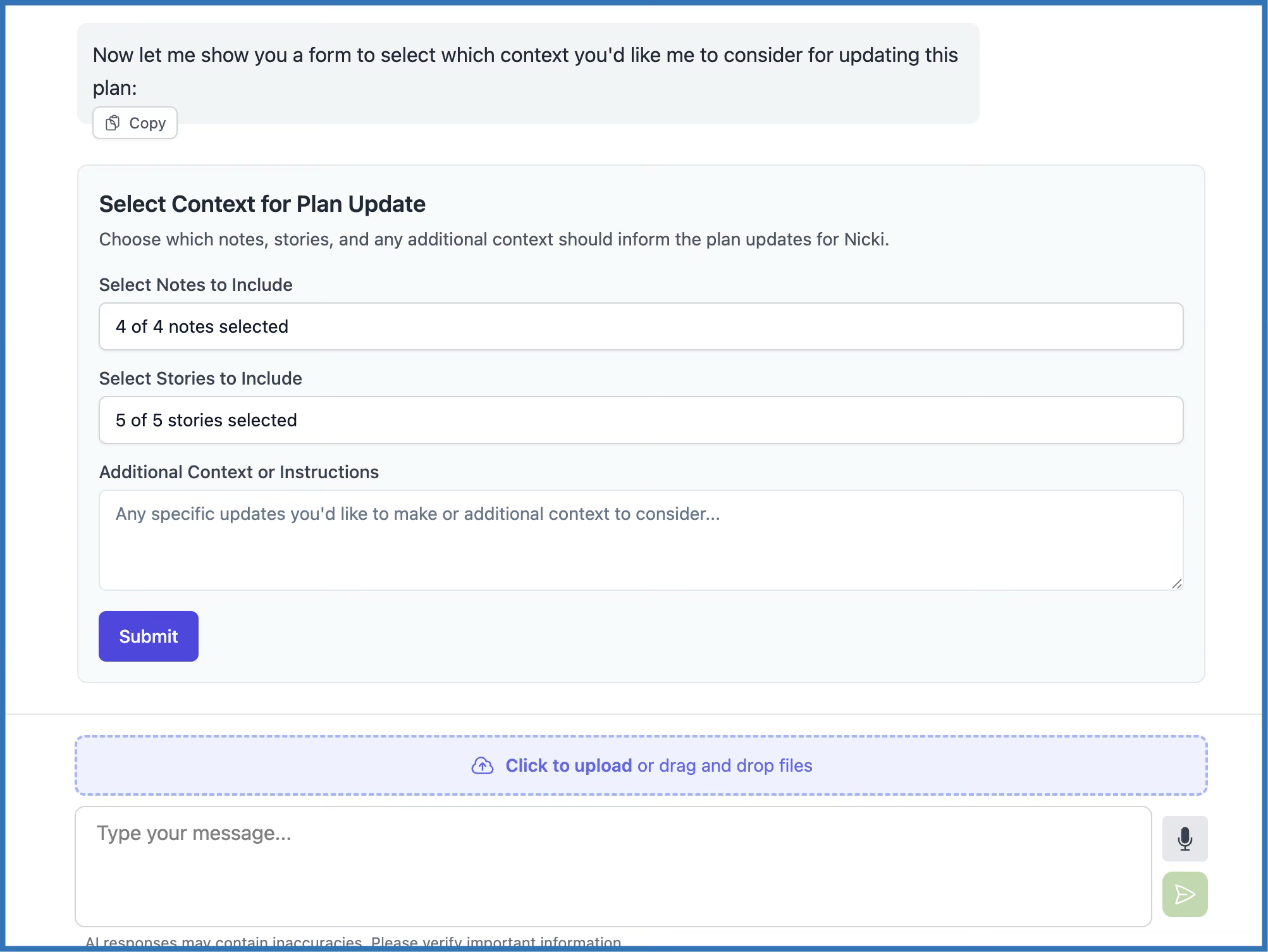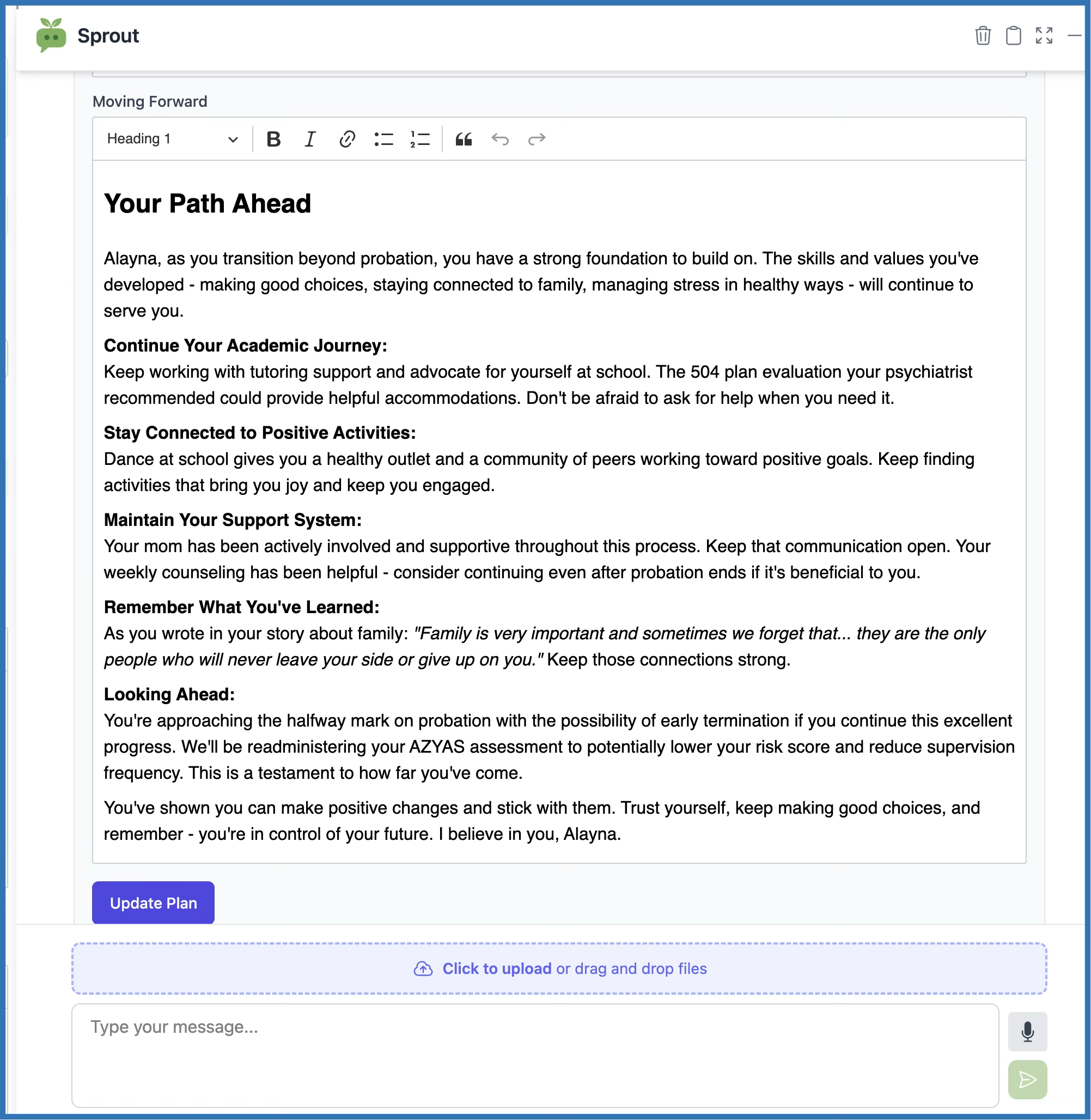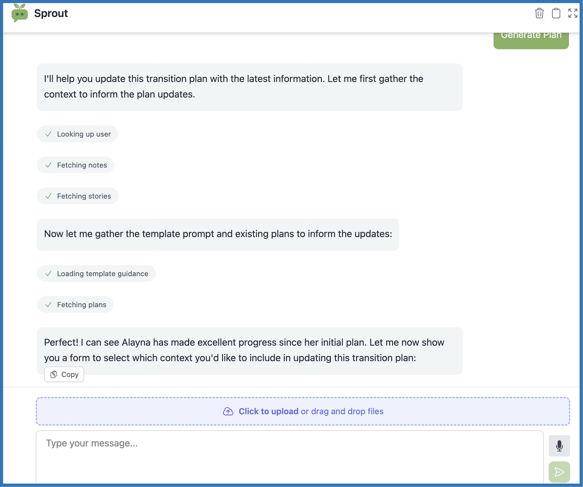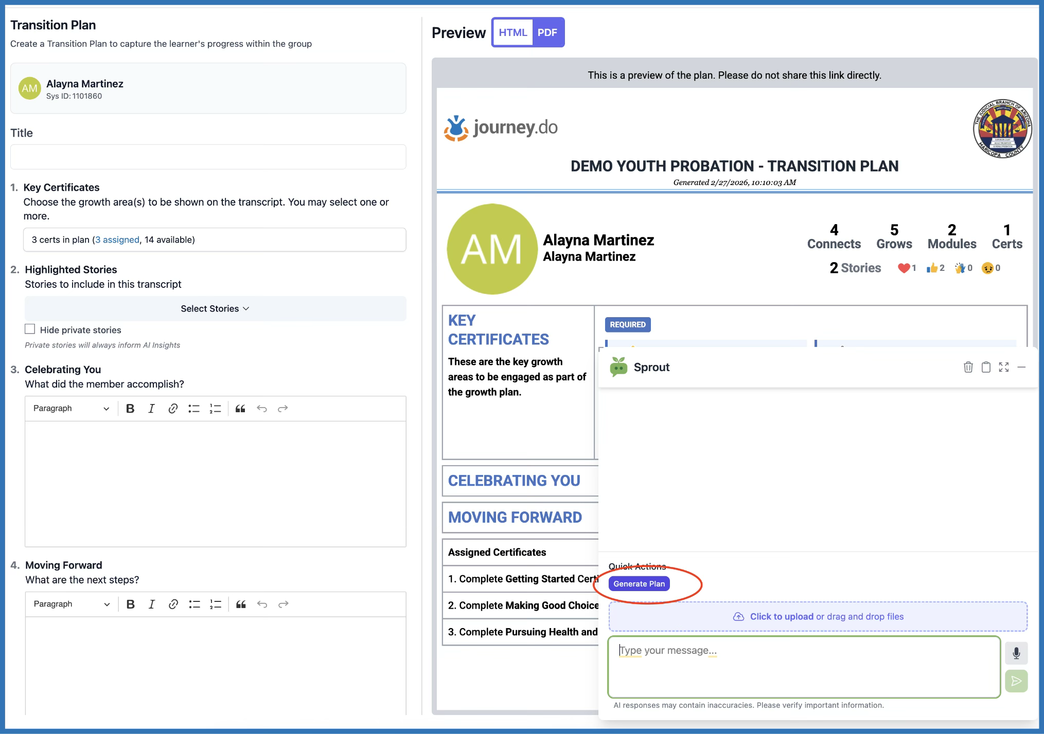Sprout can automatically generate or update a Transition Plan using the learner's notes, stories, certificates, and existing plan data.